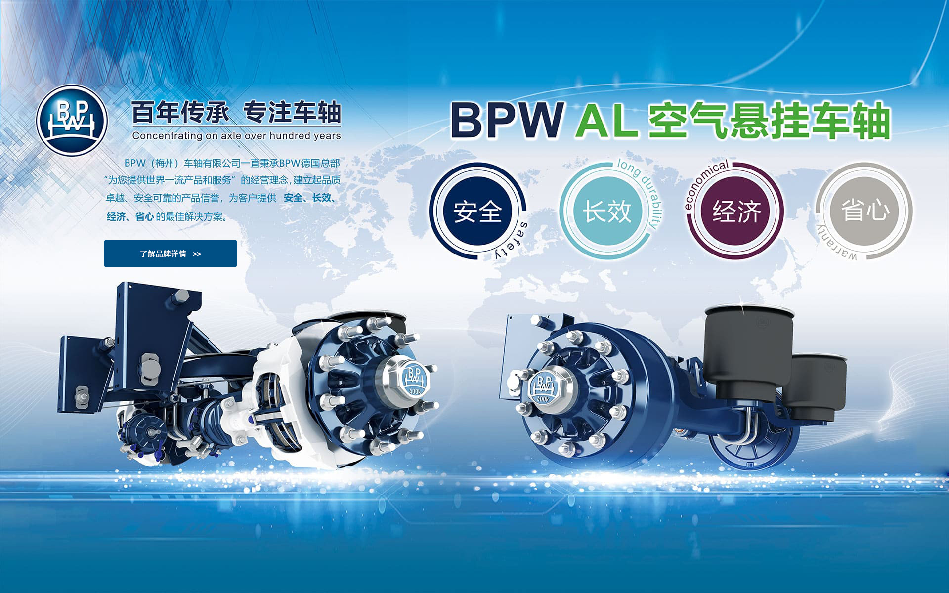 • BPW車軸公司成立于1898年,是一家超過百年歷史的半掛車車軸生產廠家,全球擁有3100多家生產基地、分支機構及服務伙伴,擁有400多項專利技術,實力雄厚,產品馳名世界。先進的技術,完備的設備和檢測系統,良好的質量意識和持續開發創新的理念,使BPW產品一直走在同行前列,是國內同行的標桿企業。